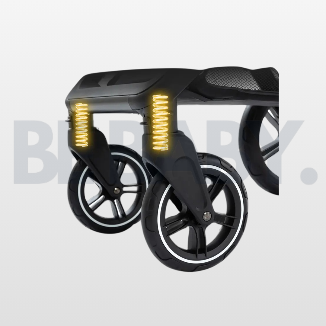 A babakocsi kiváló minőségű lengéscsillapító rendszerrel van felszerelve, amely elnyeli a rezgéseket, és sima, kényelmes utazást biztosít még egyenetlen utakon is.