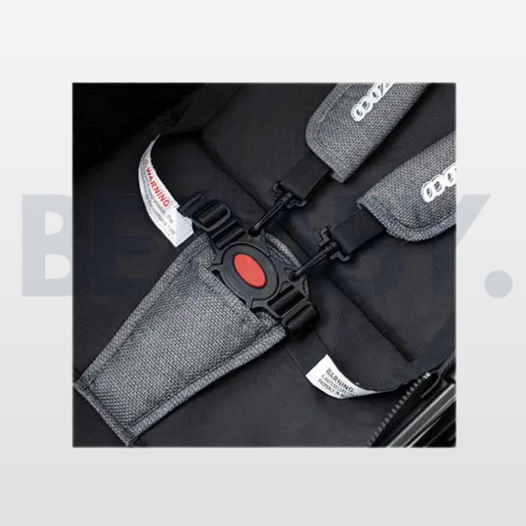 A babakocsi 5 pontos biztonsági övvel van felszerelve, amely stabilitást és védelmet nyújt a gyermeknek utazás közben.