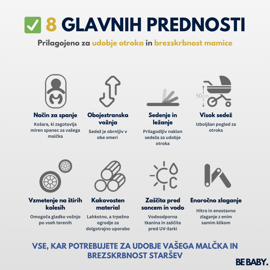 Egyszerű összecsukással és hordozhatósággal ideális a mindig mozgásban lévő szülők számára. Az elegáns kialakítás és a könnyű szerkezet megkönnyíti a mozgatást.