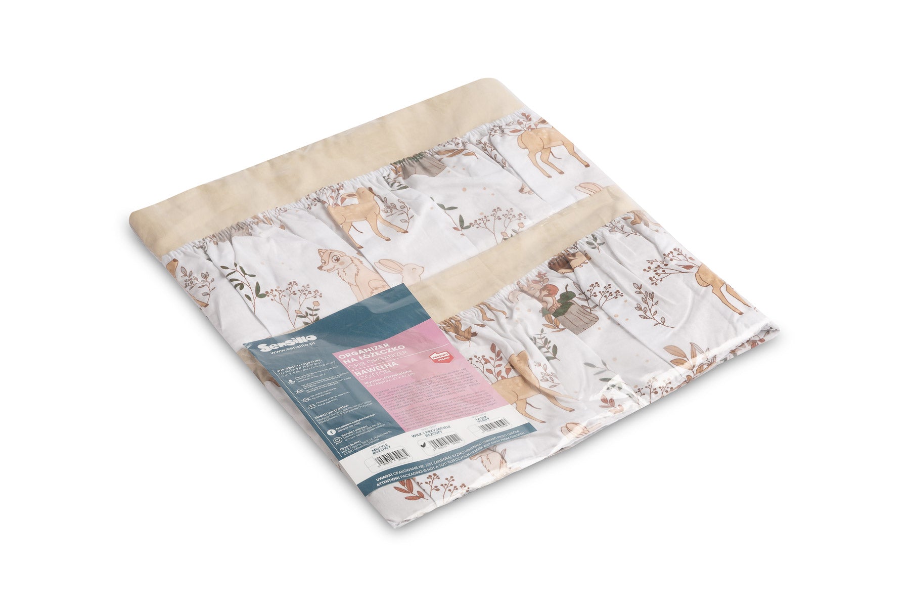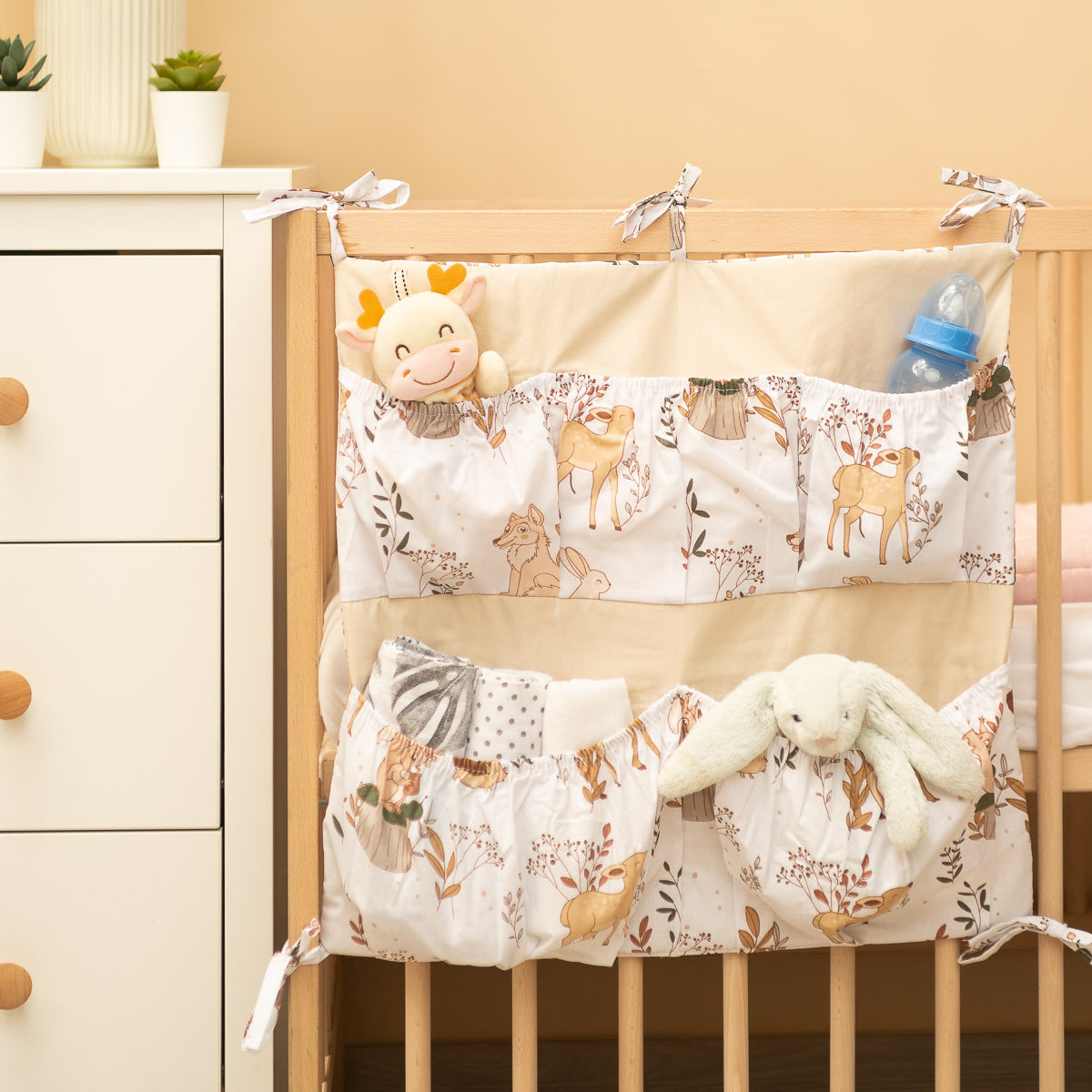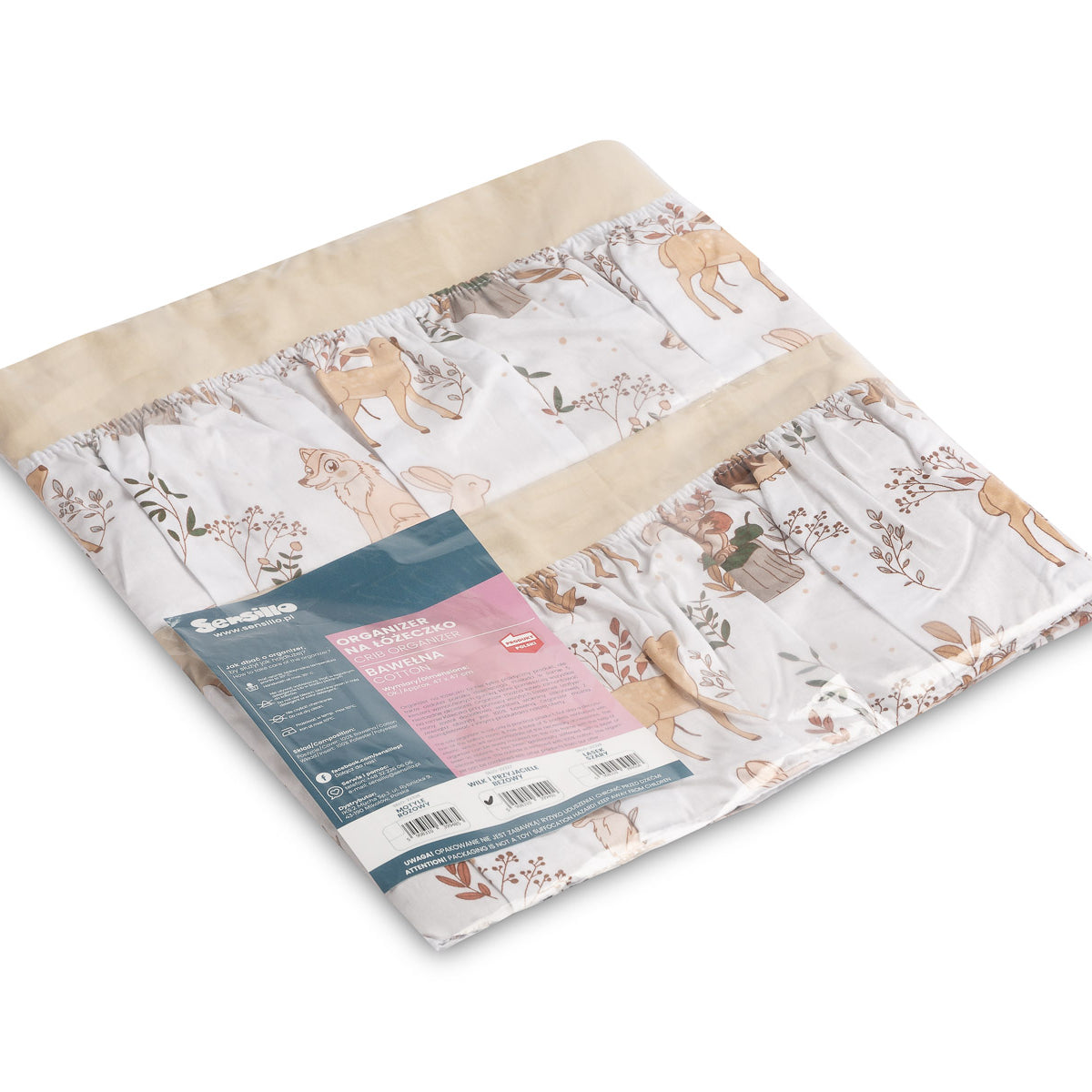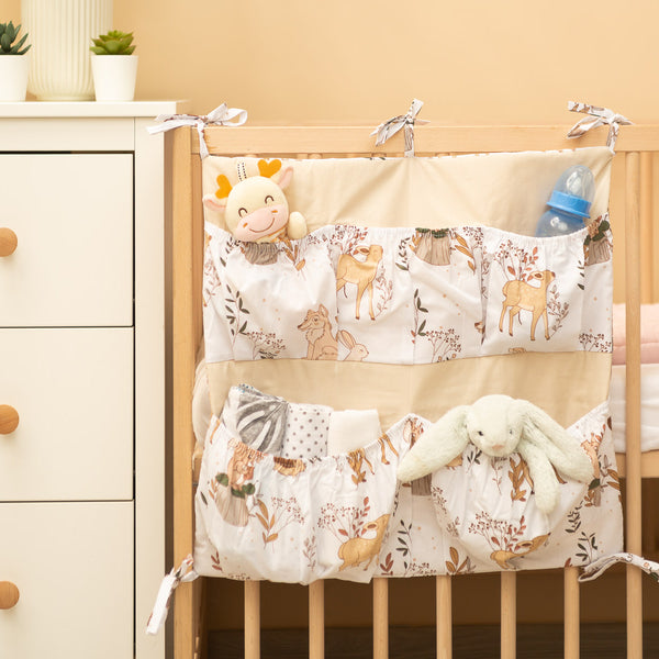 A kiságy szervezője nemcsak praktikus termék, hanem a baba szobájának dísze is. Összesen 5 zsebbel rendelkezik, amelyek rugalmas anyaggal vannak megerősítve, és minden szükséges kiegészítőt befogadnak. A szervező könnyen rögzíthető a kiságy keretéhez a bevarrt szalagok segítségével. Továbbá egy réteg szilikon fleece-szel van megerősítve. A külső rész 100% pamuttal van szegélyezve. A szervező kombinálható más termékeinkkel is.
