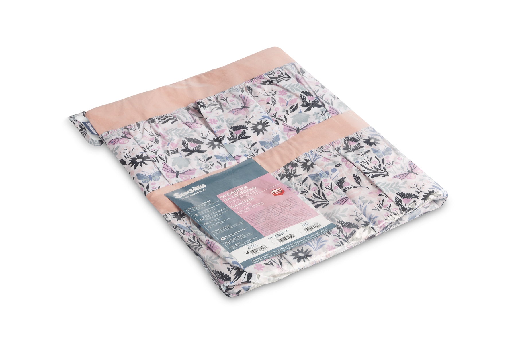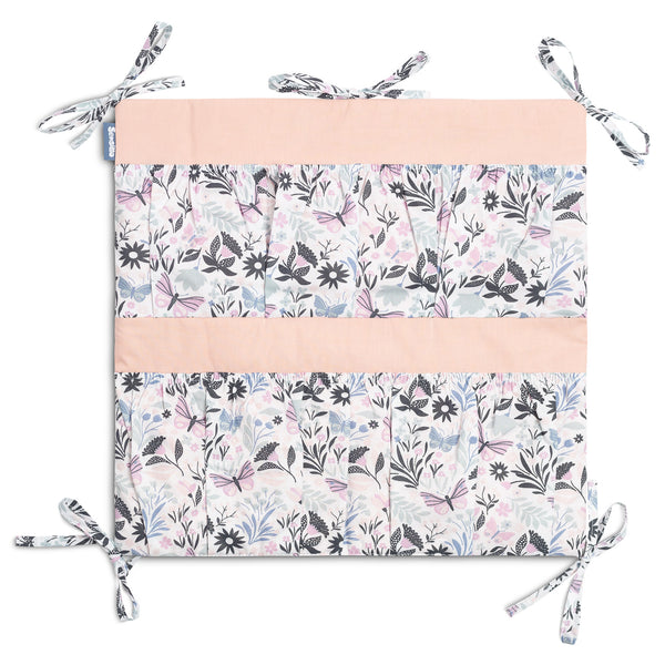 A kiságy szervezője nemcsak praktikus termék, hanem a baba szobájának dísze is. Összesen 5 zsebbel rendelkezik, amelyek rugalmas anyaggal vannak megerősítve, és minden szükséges kiegészítőt befogadnak. A szervező könnyen rögzíthető a kiságy keretéhez a bevarrt szalagok segítségével. Továbbá egy réteg szilikon fleece-szel van megerősítve. A külső rész 100% pamuttal van szegélyezve. A szervező kombinálható más termékeinkkel is.