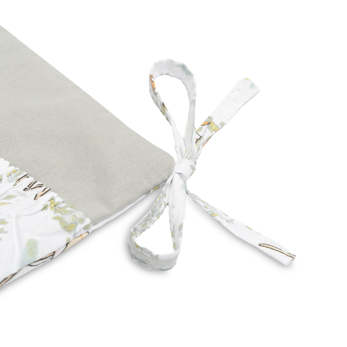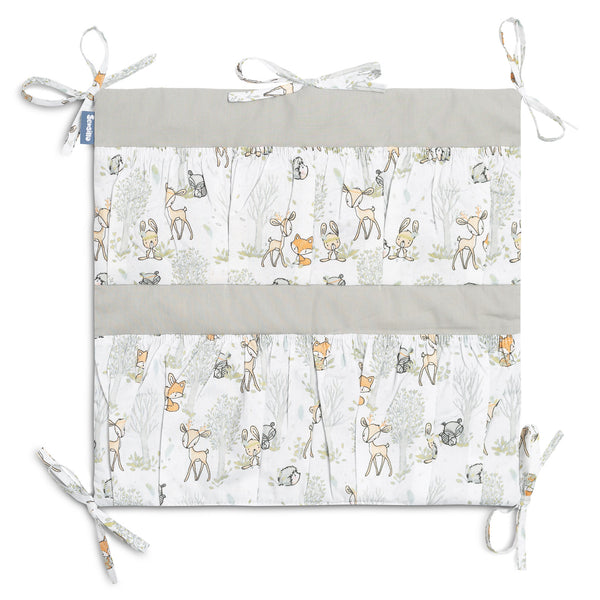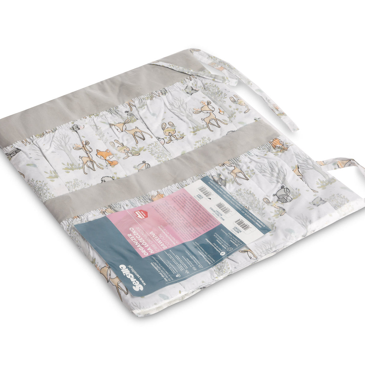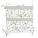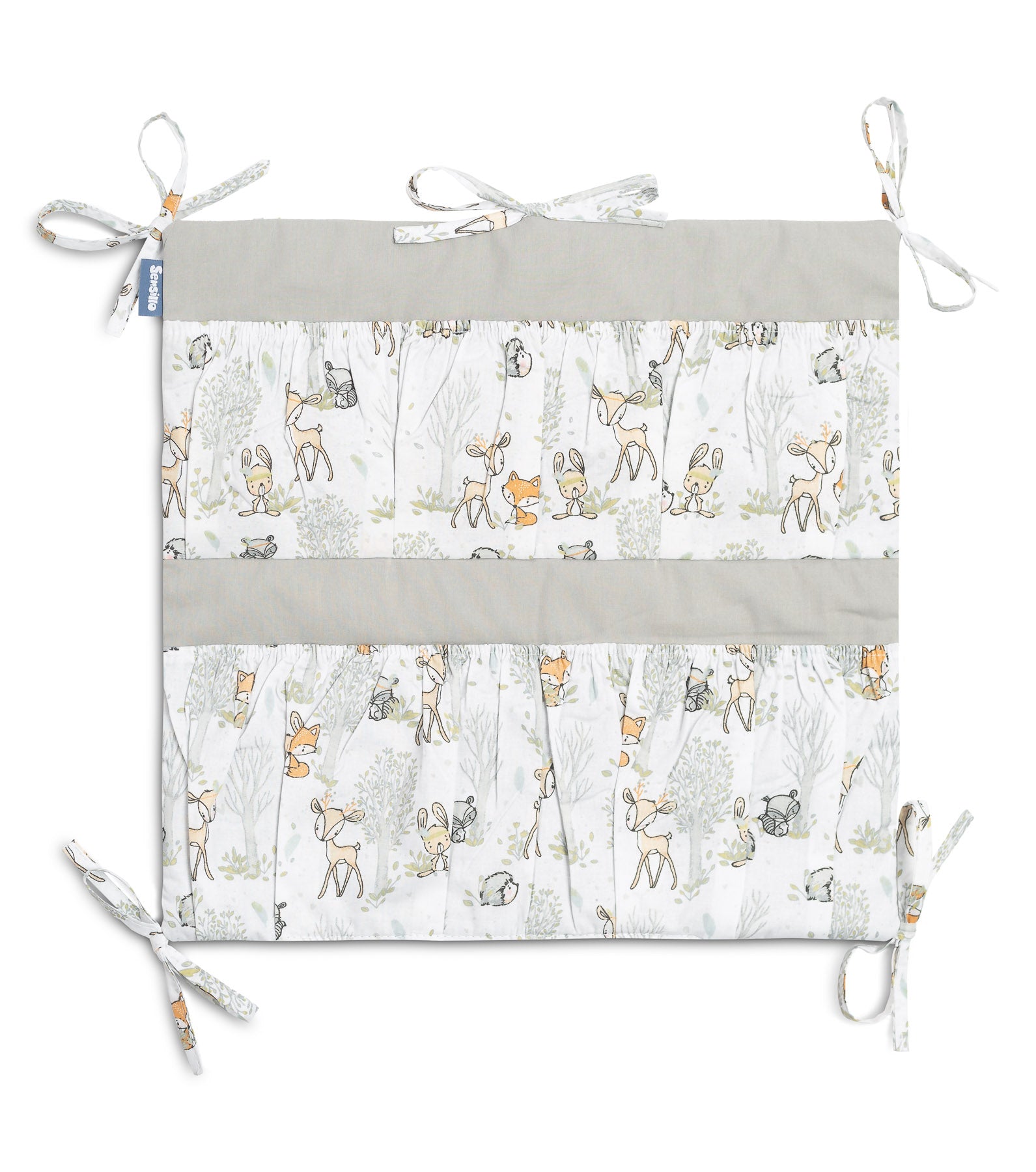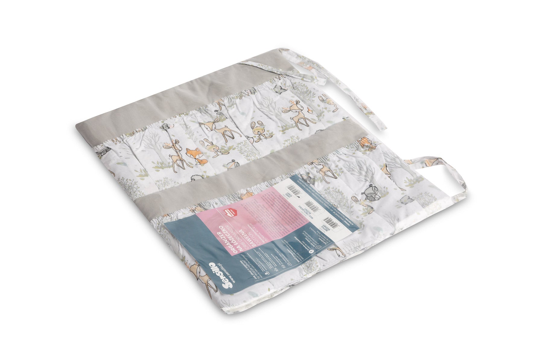 A kiságy szervezője nemcsak praktikus termék, hanem a baba szobájának dísze is. Összesen 5 zsebbel rendelkezik, amelyek rugalmas anyaggal vannak megerősítve, és minden szükséges kiegészítőt befogadnak. A szervező könnyen rögzíthető a kiságy keretéhez a bevarrt szalagok segítségével. Továbbá egy réteg szilikon fleece-szel van megerősítve. A külső rész 100% pamuttal van szegélyezve. A szervező kombinálható más termékeinkkel is.